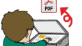 プリンターのスキャナー機能を使って書類をPDFとして保存する様子のイラストです。(青矢印)